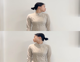 两点:头颈尽量向左上方拉伸成45度角,头回到正位;而后头拉伸至右上方45度,头回到正位。