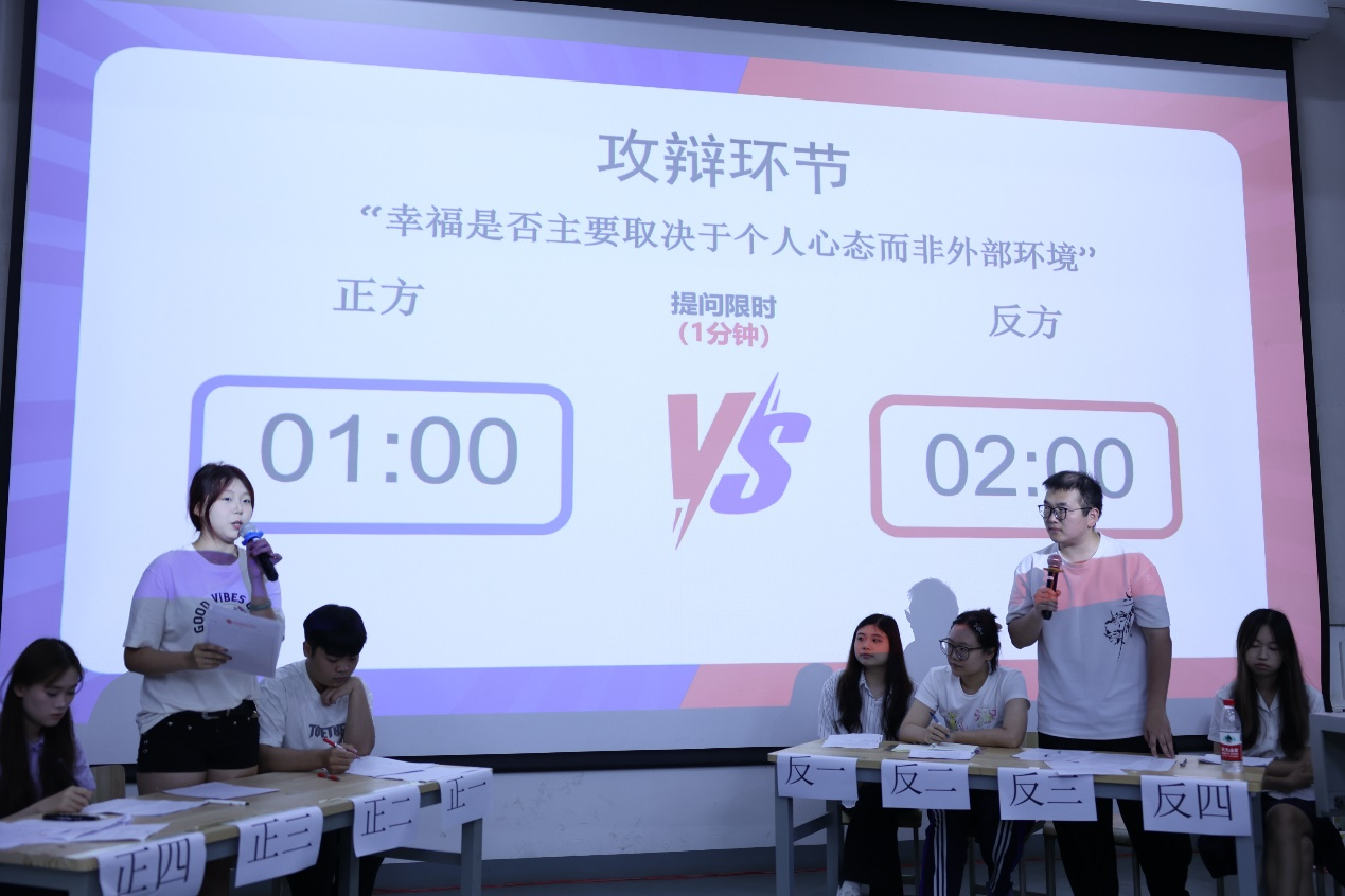 首场辩论围绕“幸福是否取决于个人心态而非外部环境”展开交锋。正方选手通过事例论证心态对幸福的决定性作用;反方立足现实强调外部环境的关键影响。双方辩手思维敏捷、妙语连珠,在自由辩论环节更是金句频出,激起了现场活跃的气氛。
