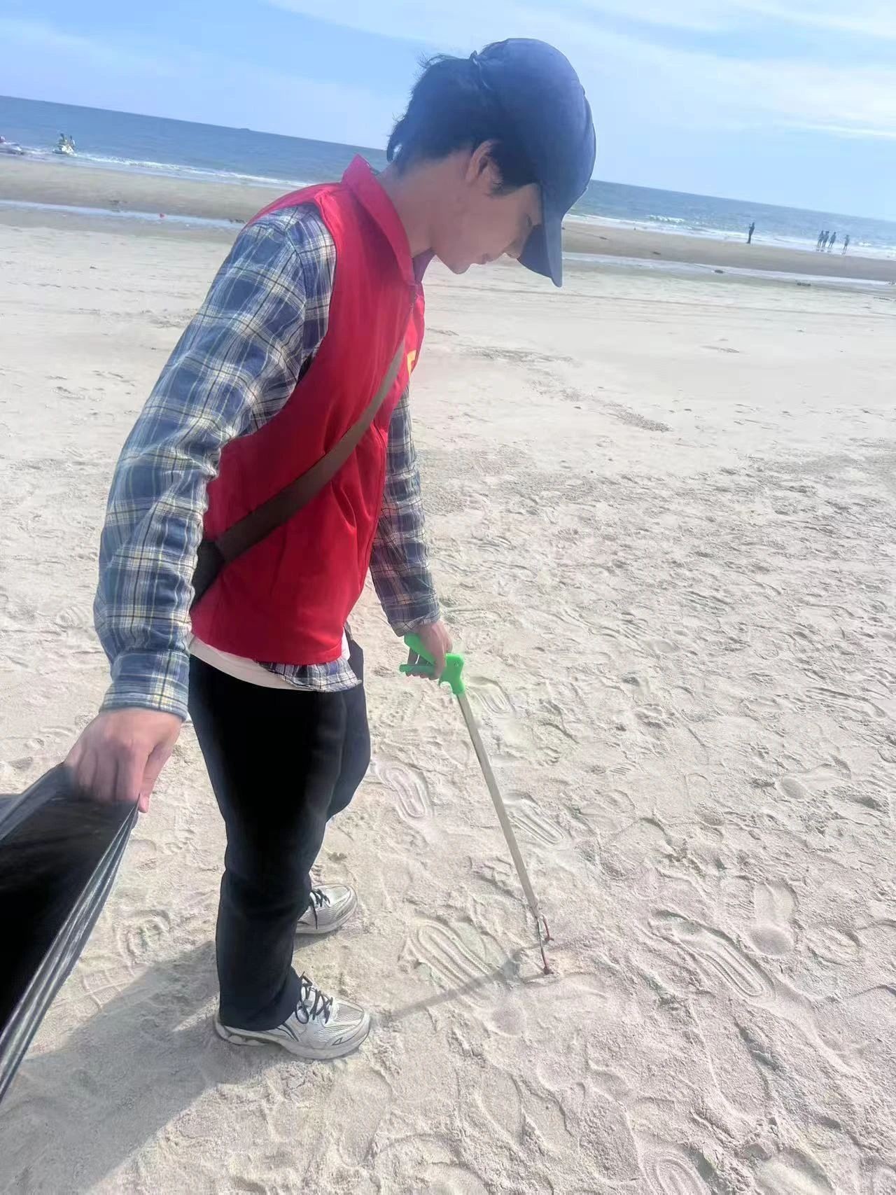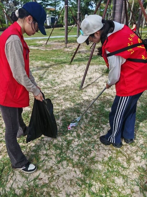 活动当天,在老师的分工下,各组领取清洁工具,为净滩行动做好充足准备。抵达银滩后,志愿者们迅速分头行动,手持工具,仔细搜寻每一处角落,将海滩上的塑料瓶、碎纸片、果皮等废弃物逐一“收入囊中”。他们互相配合,弯腰、捡拾、分类……动作重复却充满力量。烈日炎炎下,汗水浸湿了衣衫,但大家的热情丝毫不减。