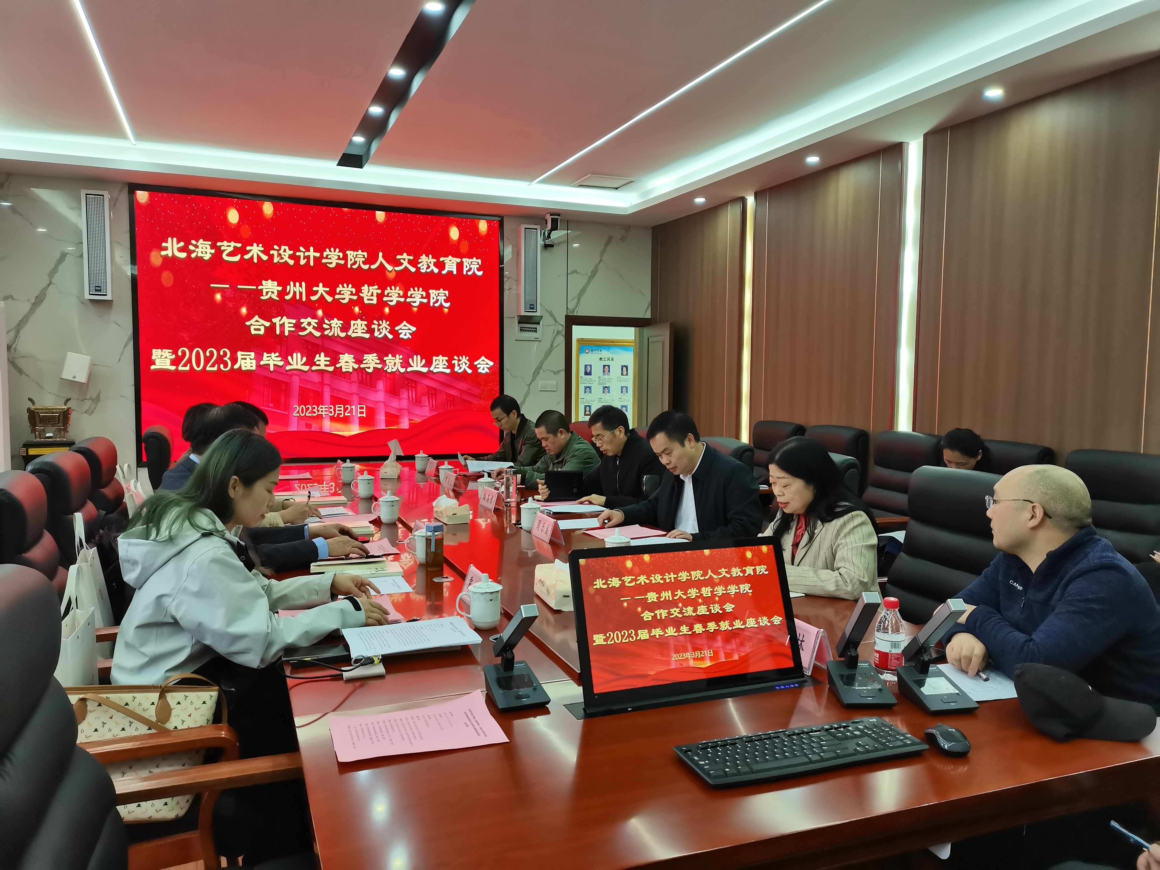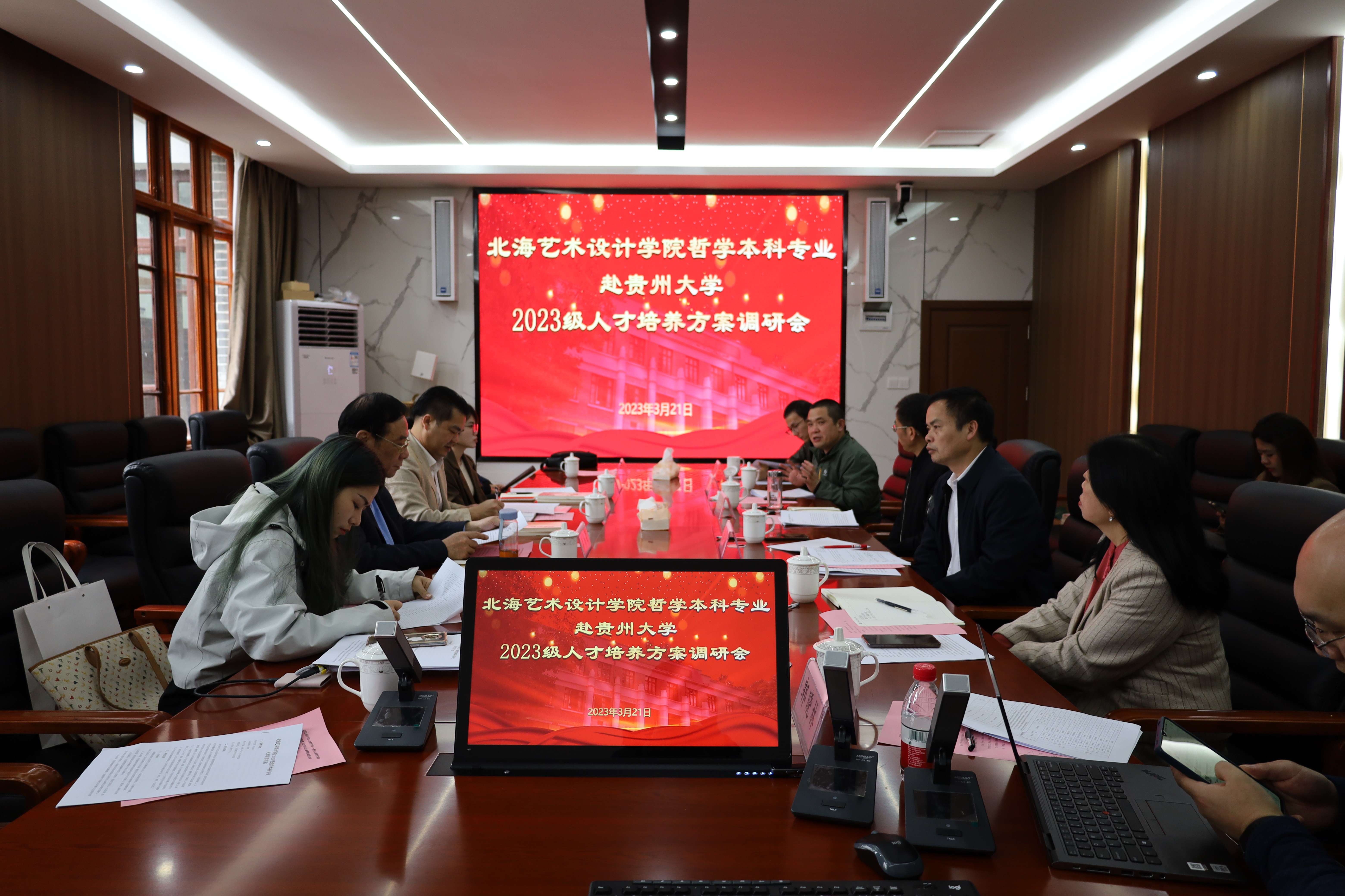 贵州大学哲学学院党委书记周乐成、院长陈艳波、副院长梅其君、贵州大学哲学学院教学督导等人对我校人文教育学院领导和教师的来访表示热烈欢迎。2023级哲学人才培养方案调研座谈会中,双方围绕人才培养方案,学科建设,两校资源共享、交流互通的合作以及吸纳更多贵州大学优秀毕业生加入北海艺术设计学院等方面进行了深入的交流。