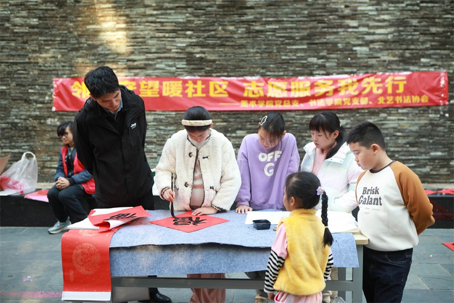 12月21日,正值冬至,由我校美术学院党总支、书法学院党支部、北艺书法协会联合举办的“邻里守望暖社区,志愿服务我先行”活动在橄榄苑小区顺利举行。校党委副书记彭仁、美术学院执行院长龚为莅临现场指导活动。