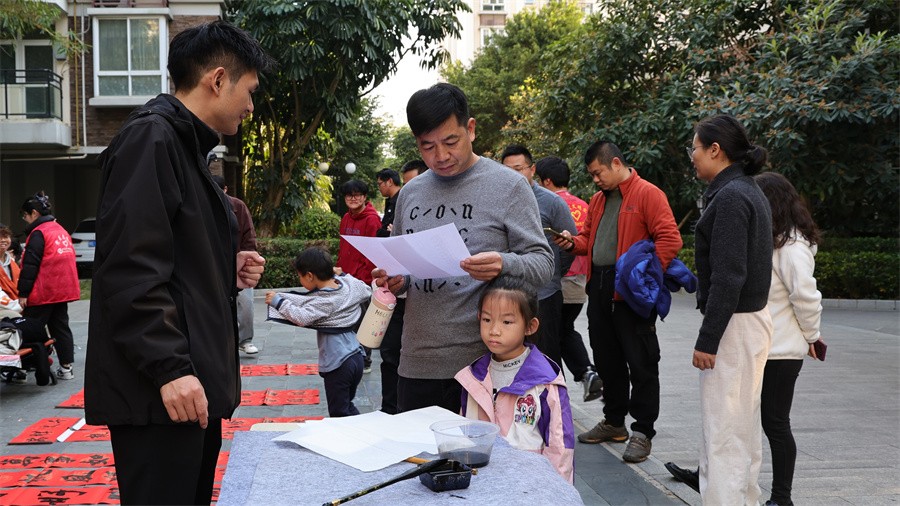 活动现场,美术学院、书法学院师生们热情洋溢,充分发挥自身专业优势,以笔为媒,以墨传情,营造浓厚的节日气氛,为社区居民送上了最真挚的祝福。书法学院党支部书记喻广林,书法学院党支部副书记左云飞,书法学院学工办主任兼分团委书记李家琪,美术学院学生第一支部副书记许荣军,书法学院教研室副主任张天赋,书法学院教师江威龙、石建玲等在活动现场书写春联,共同为社区居民送去新春祝福。居民们精心挑选内容心仪的春联,美好祝愿凝聚于纸张之间,传播着生活的美好与希望。