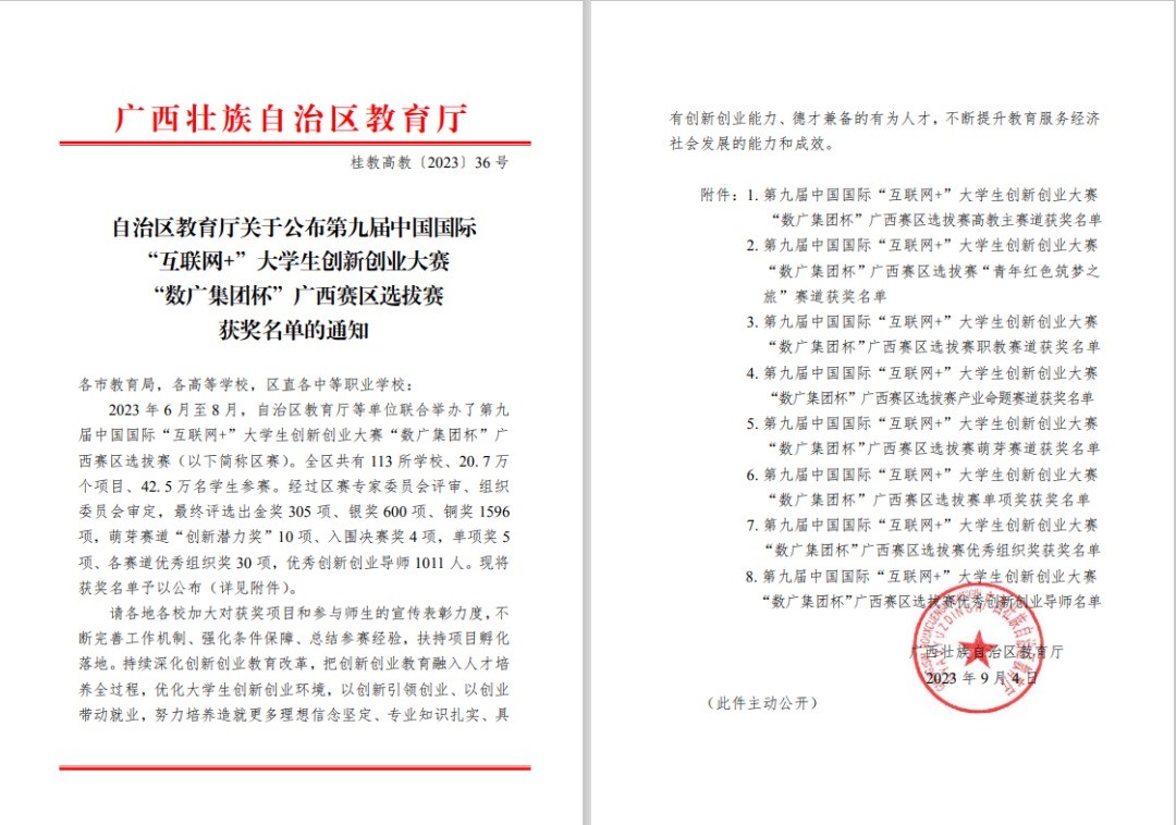 近日,广西壮族自治区教育厅发文公布了第九届中国国际“互联网+”大学生创新创业大赛“数广集团杯”广西赛区选拔赛获奖名单,我校斩获奖项共17项,其中,项目《惊喜八桂与“坭”同行》斩获自治区级金奖,其它晋级区赛的16个项目荣获自治区级铜奖。