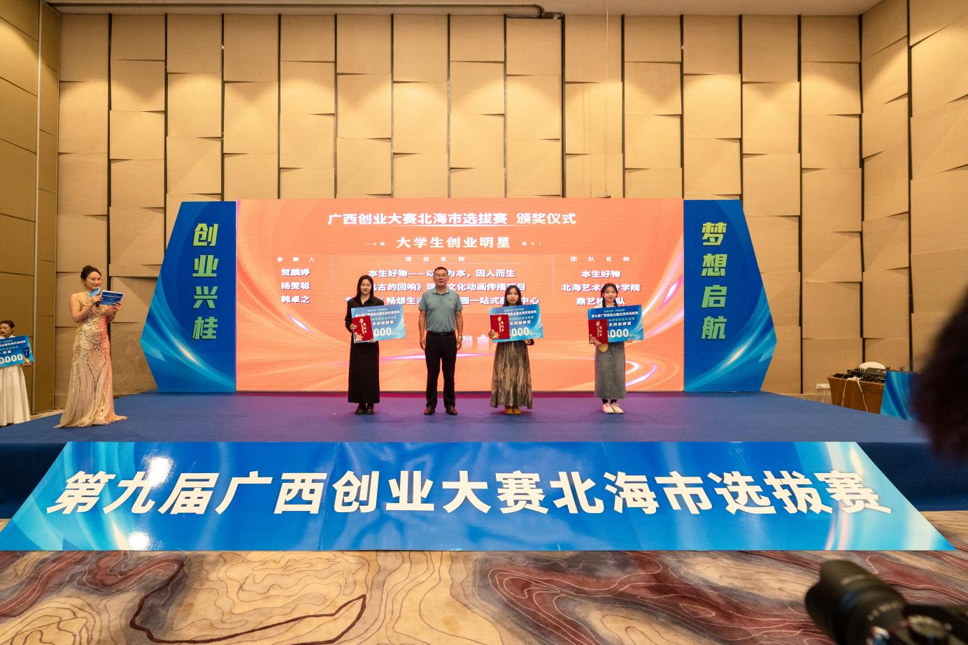 历经2天的激烈角逐,大赛最终共决出四个赛道各奖项。我校学生参赛项目“本生好物——以人为本,因人而生”、 “《远古的回响》瑶族文化动画传播项目”、“专注学生 畅想生活——鼎艺校园一站式服务中心”分别斩获“大学生创业明星评选专项赛”赛道的一、二、三等奖。其中排名前二的项目将代表北海市参加下一阶段的广西区赛。
