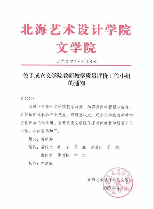 关于成立文学院教师教学质量评价工作小组的通知