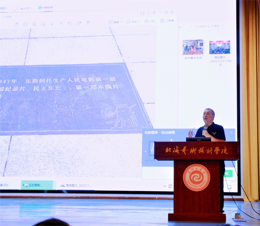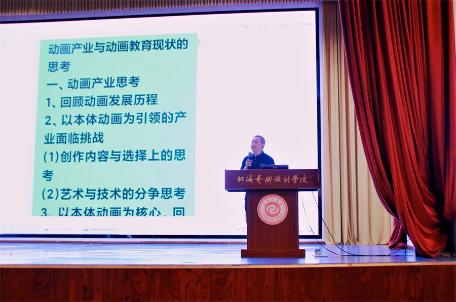 随后,王钢教授就本体动画引领的产业面临挑战展开讲授。王钢教授表示,动画的创作内容在选择中国经典的同时,也要将视角放在当下,展现当代的人民生活面貌,反映新时代的民族精神。他还提到要以本体动画为核心,回归中国学派,重视动画中意象化的处理,传承中国特色的表演体系。他希望大家与时俱进,多元化、多视角的看待事物,不断学习新技术与技艺,增强自身的艺术素养。