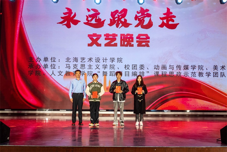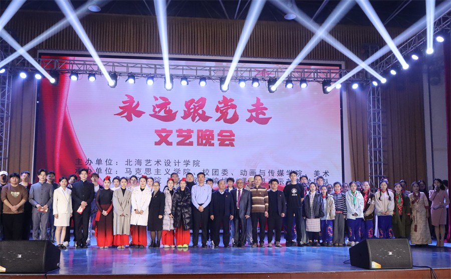 12月26日晚,我校在西校区大礼堂举办“永远跟党走”文艺晚会。晚会由北海艺术设计学院主办,马克思主义学院、校团委、动画与传媒学院、美术学院、人文教育学院“舞蹈剧目编排”课程思政示范教学团队联合承办。学校党委书记范徽忠,副校长陶立阳,马克思主义学院院长姜献生,校团委书记唐良春,人文教育学院党总支书记、院长熊秀峰等出席晚会。同时,本次晚会面向全体党员、发展对象和积极分子。