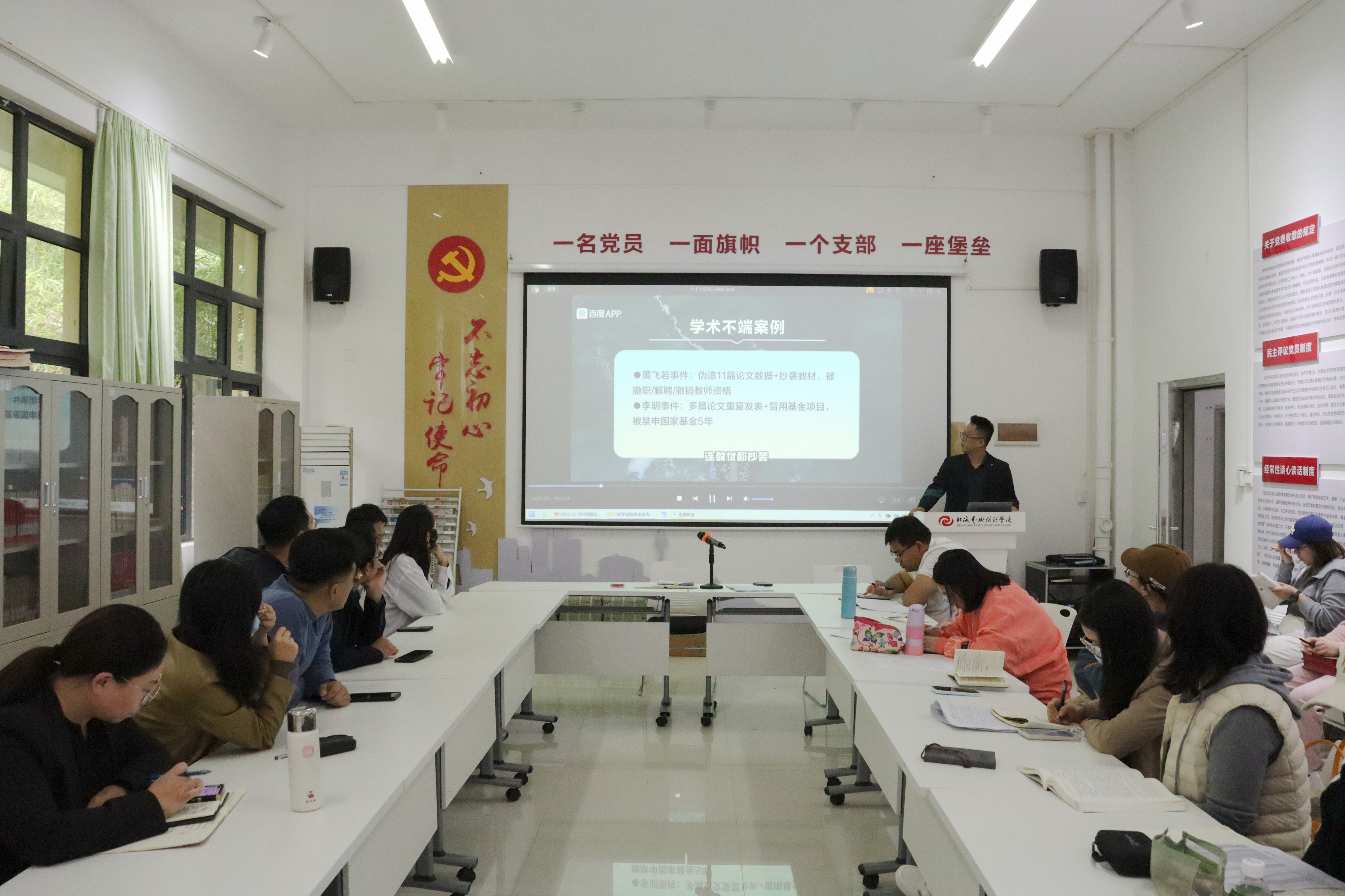 首先,我院副院长张宇飞围绕《北海艺术设计学院科研诚信管理办法》进行了系统解读,他着重强调了“科研诚信是科研质量的基石,更是学术研究的生命线”,深入剖析了“抄袭剽窃、数据造假、一稿多投、不当署名”等科研不端行为的具体表现。