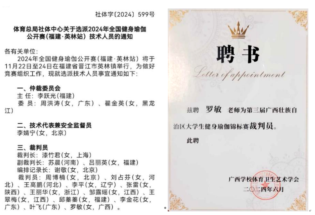 我校罗敏老师作为国家级健身瑜伽裁判员,积极参与了2024年全国健身瑜伽公开赛(晋江英林站)和广西壮族自治区大学生健身瑜伽锦标赛的裁判工作。
