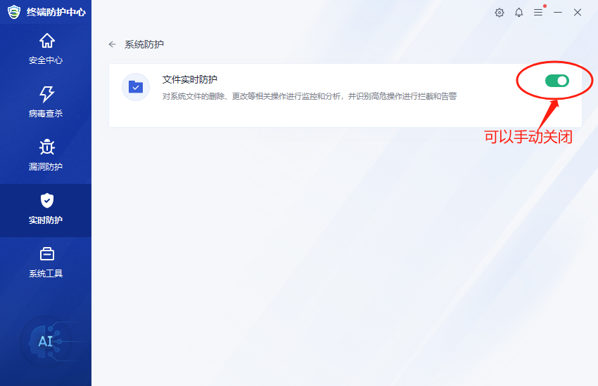 2.“系统防护”里面的“文件实时防护”右侧手动点关闭,这时就可以正常打开需要的激活软件,激活之后再将“文件实时防护”重新打开,继续保护电脑安全。
