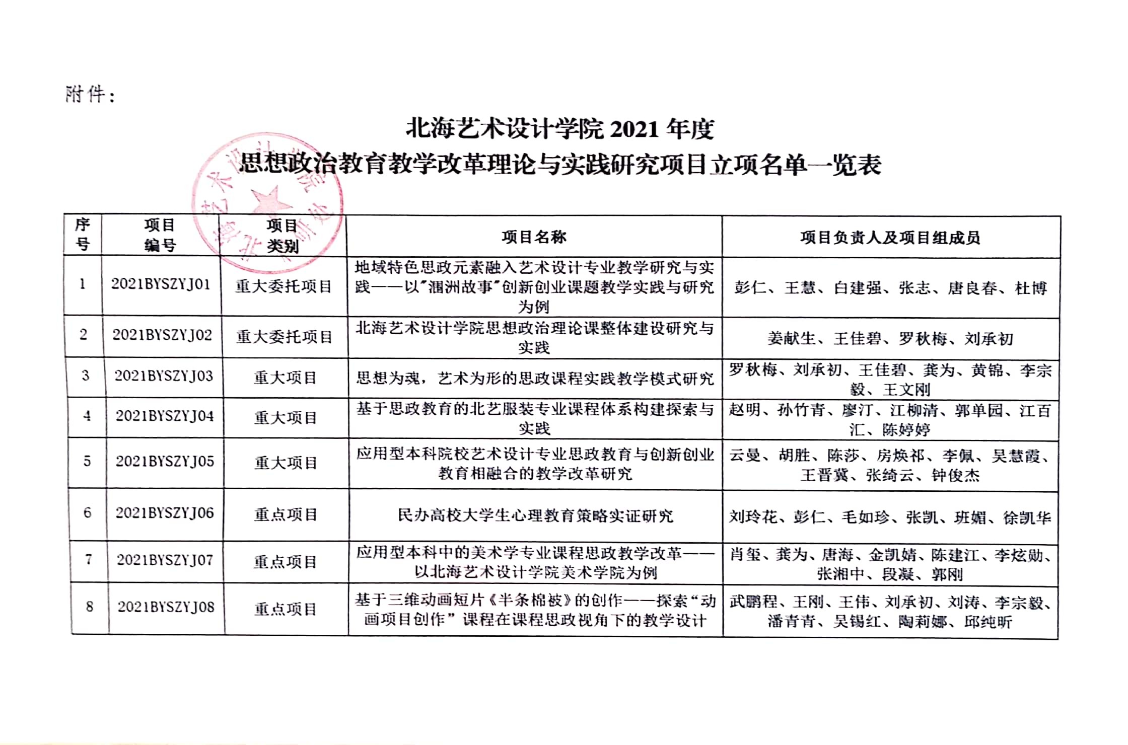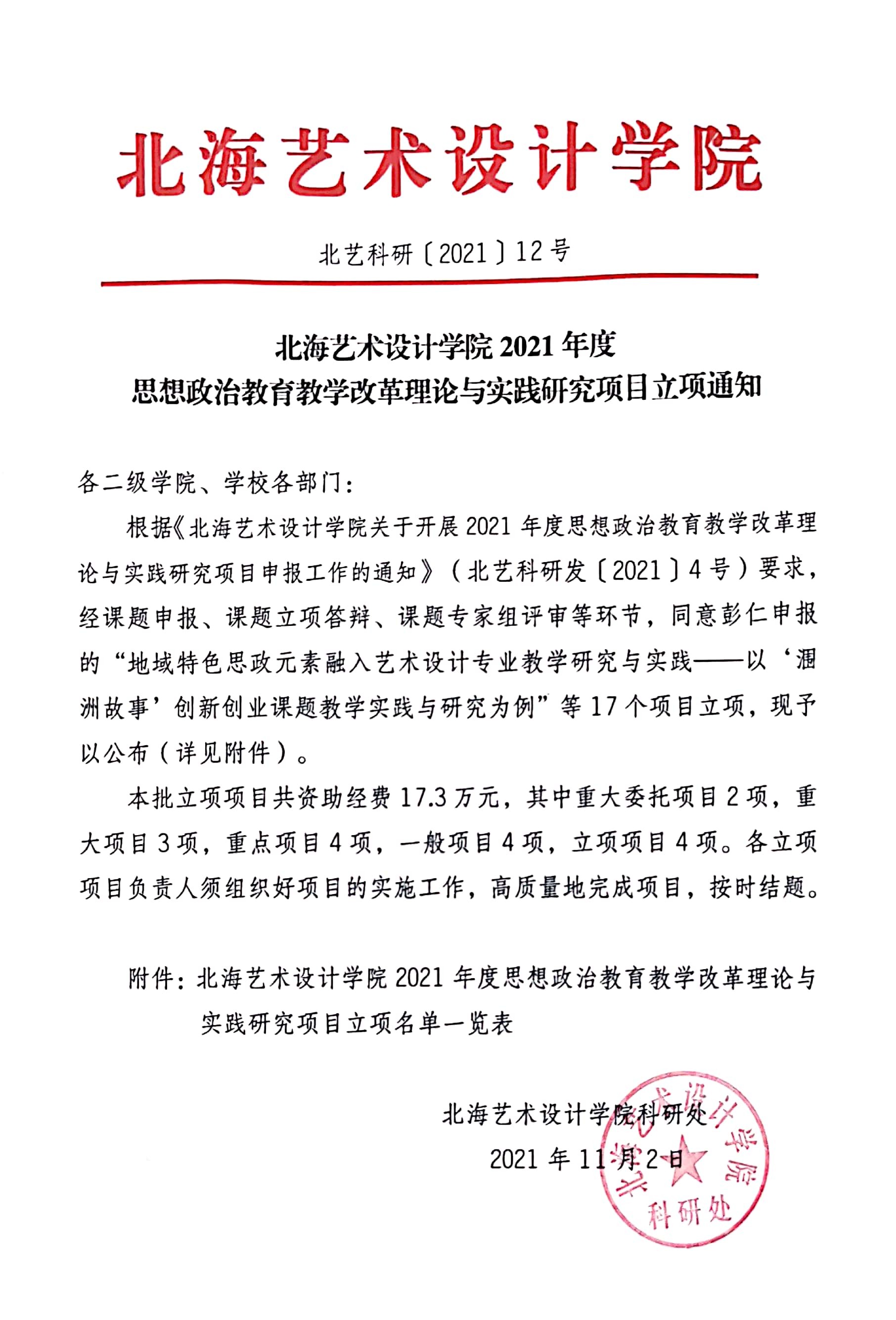 北海艺术设计学院2021年度思想政治教育教学改革理论与实践研究项目立项通知