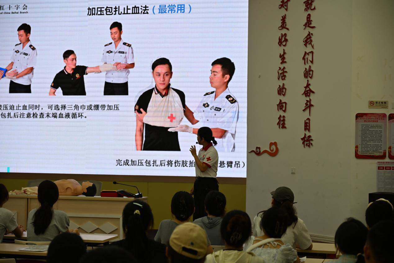 紧接着,北海市红十字会林老师向志愿者们培训应急救护知识,培训涵盖了海姆立克急救法、昏厥与癫痫发作的现场处理、创伤包扎、心肺复苏以及AED的使用方法等多个实用模块。