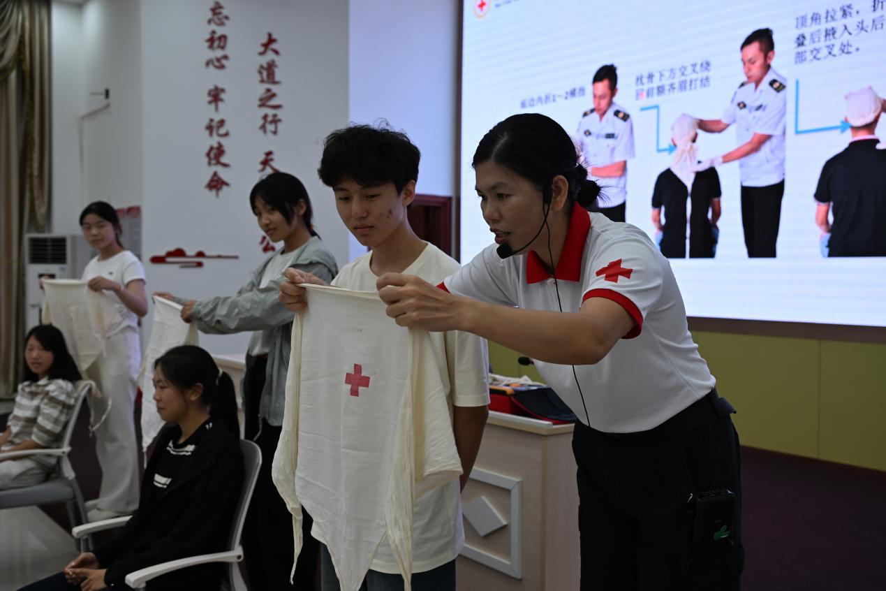 理论讲解之后,林老师利用教具进行了操作演示,并邀请志愿者上台实操演练。在老师的指导下,同学们练习了急救包扎、心肺复苏和AED使用,掌握了关键要领。这些实用技能的培训使志愿者们不仅掌握了基本的急救技能,更增强了面对突发事件时的心理素质与责任意识。