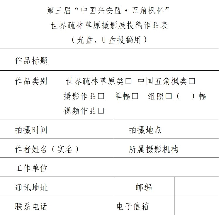 投稿时必须填写完整作品标题、拍摄时间、地点、人物、事件以及简要说明,否则无法上传作品,凡因提交的个人信息不全面而影响联络者,视为自动放弃参展资格。投稿作品以光盘(CD-R或DVD-R)、U盘存储形式邮寄至:北京市东城区东四十二条48号中国摄影报社活动项目部“第三届五角枫杯世界疏林草原摄影展”办公室收(100007)
