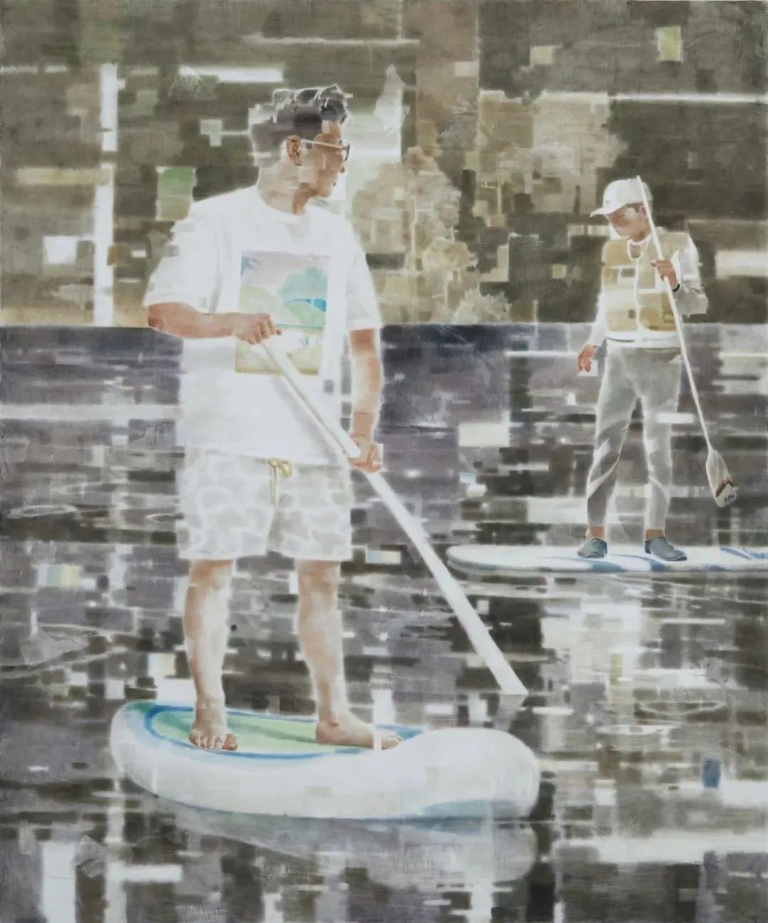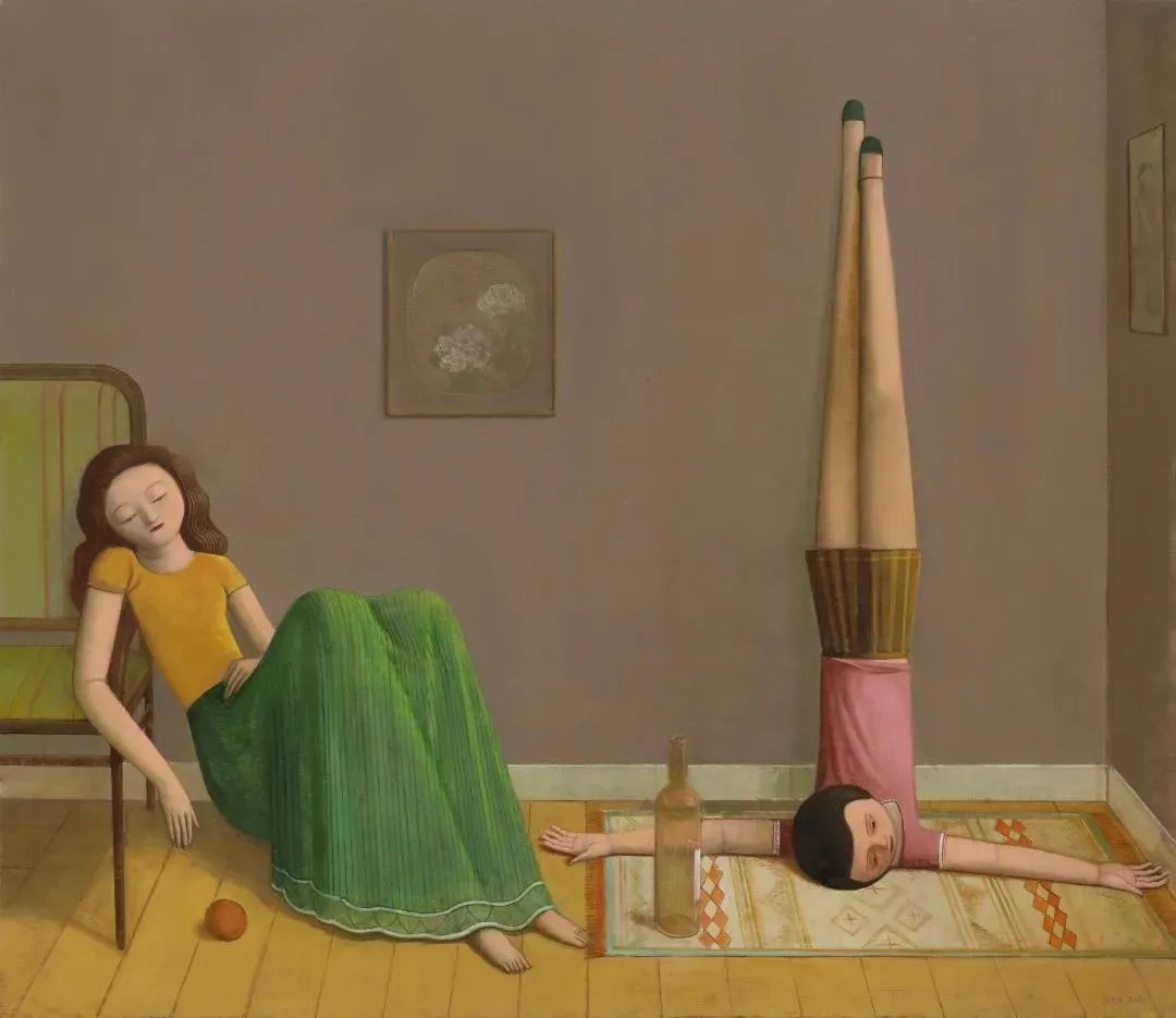 季鑫近年的绘画集中表现了类似的女性形象和状态,她们往往独处于相对幽闭的室内环境,慵懒的体态伴随着空洞、出神的目光,仿佛睡醒之后仍然被梦的余绪缠绕。在夏禹的画面中,始终可见光的浮动与沉降,萦绕着不同情境里的人物。