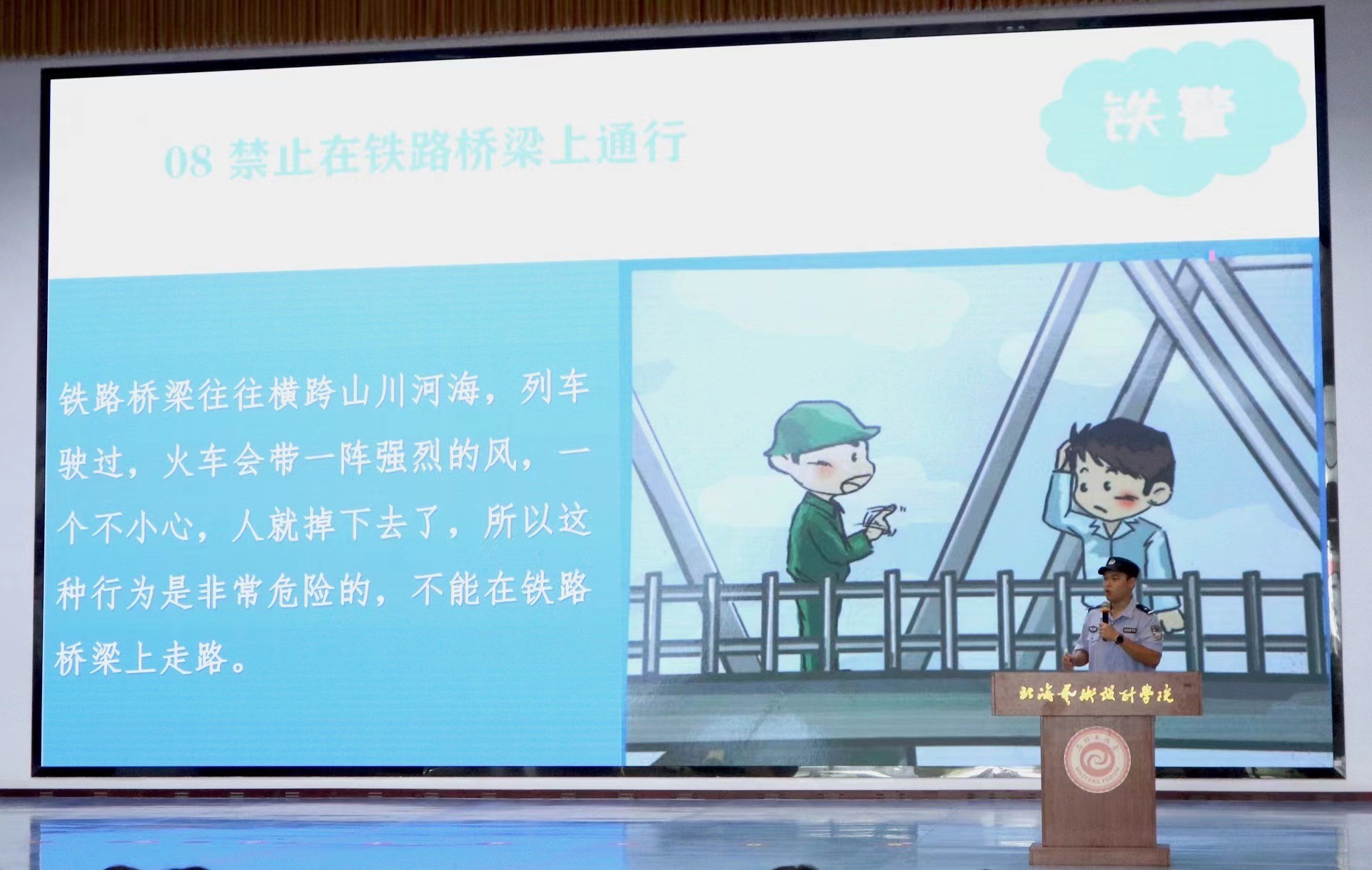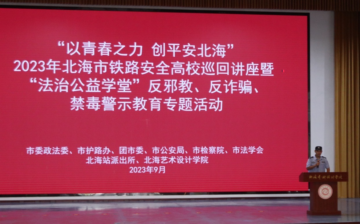 为进一步提升全体师生的安全意识和防范能力,增强铁路安全、爱路护路意识,提高反电诈、禁毒等意识,2023年9月27日下午,市委政法委、市护路办拟联合市公安局、团市委、市法学会、北海铁路公安处于我校西校区大礼堂,开展了“以青春之力 创平安北海”北海市铁路安全高校巡回讲座暨“法治公益课堂”反邪教、反诈骗、禁毒警示教育专题活动。