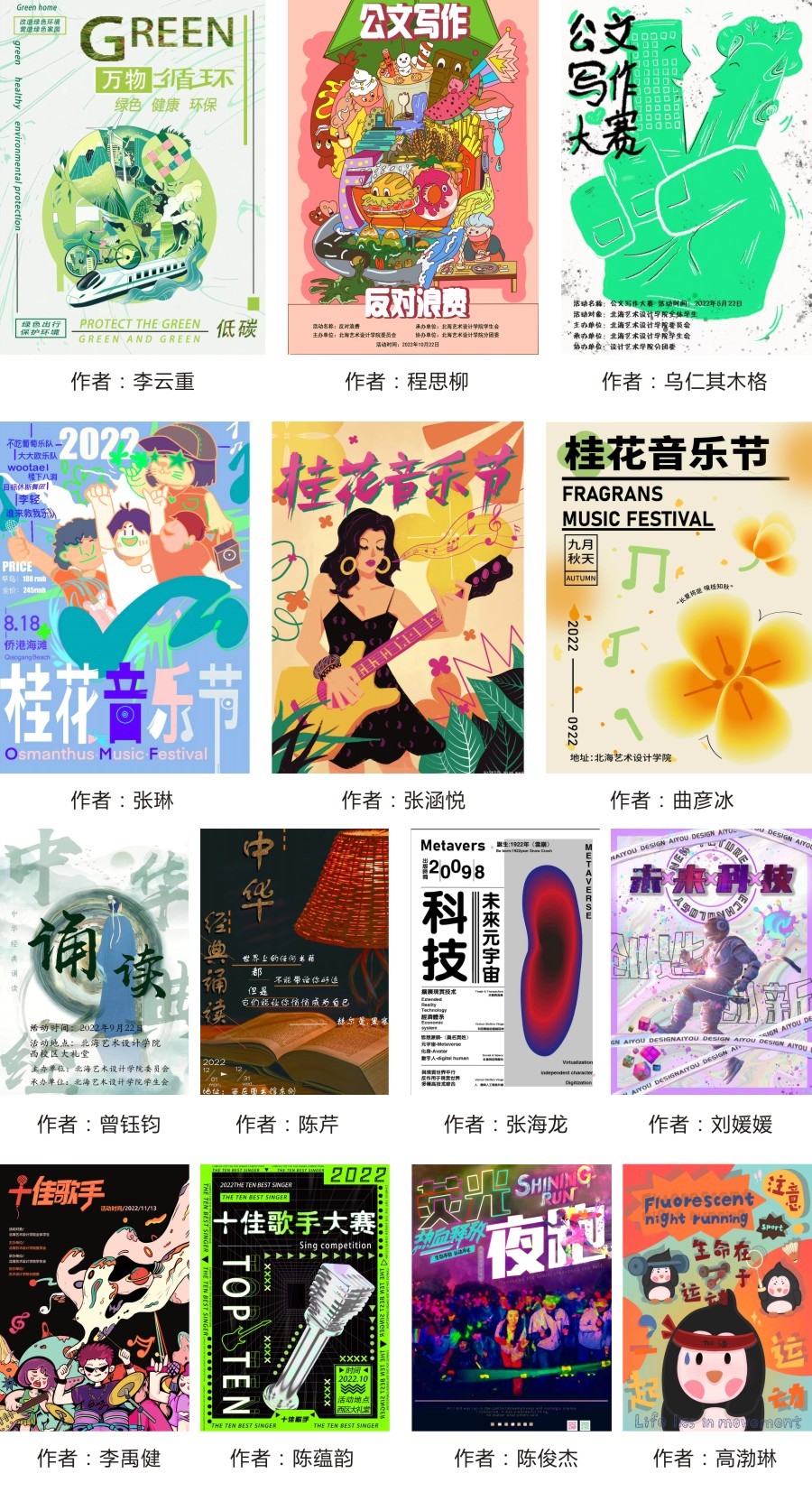 比赛选题共分为中华经典诵读、公文写作大赛、荧光夜跑、科技创未来十佳歌手、桂花音乐节,自2022年9月10日启动以来,得到了积极反响,征集活动历时22天共收到百余幅作品。于9月22日在行政楼118举行评审,由设计艺术学院团委老师和专业老师组成的评委团从作品的艺术性、技术性、美观性与识别性四个角度对作品进行综合考量,最终有24幅获奖作品从中脱颖而出。