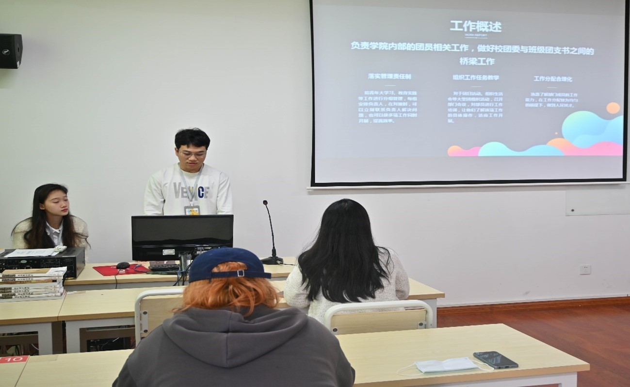 会议第二项,分团委组织部、办公室、宣传部、学术部、仪部、纪检部、学生会组织部合唱团部长依次上台发言。各部长对本学期工作进行总结,对下学期工作做出规划他们表示,加强部门间沟通协作,让部门内部以及部门之间工作更加协调。