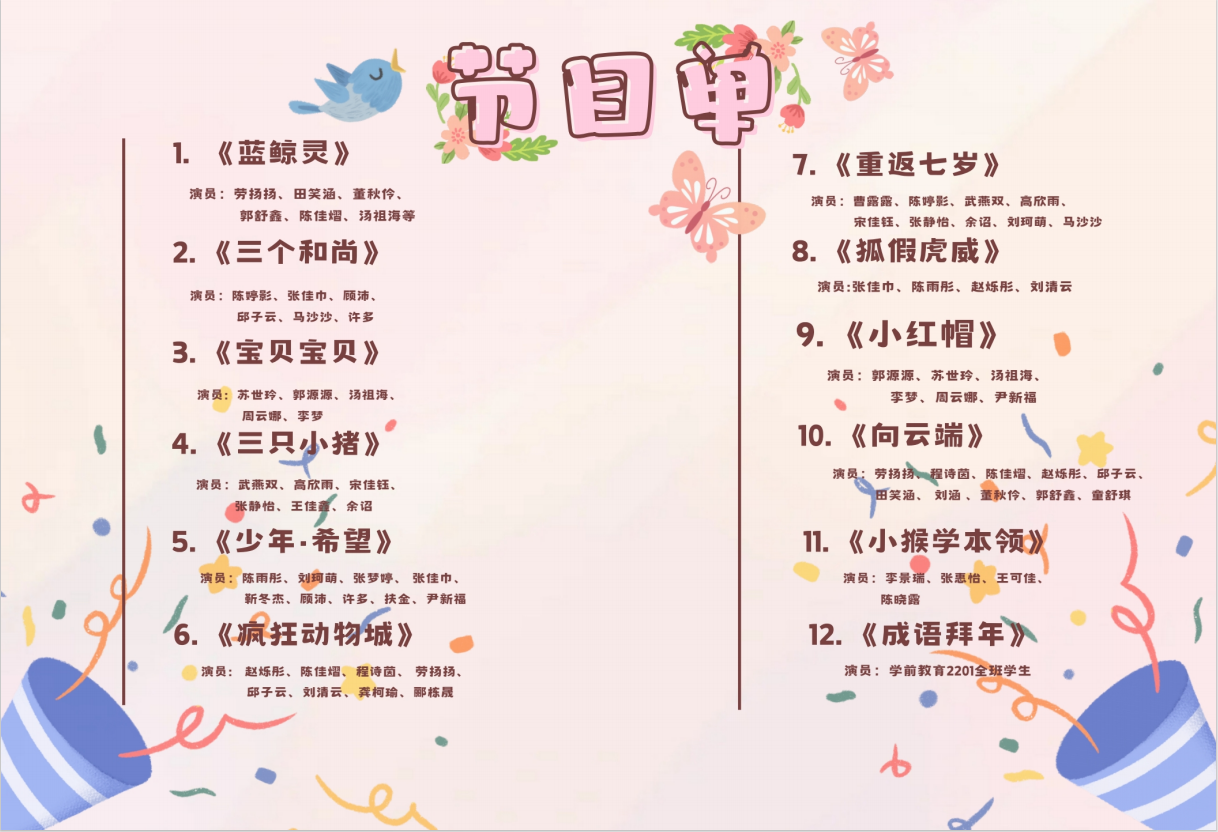 本次儿童文学与创作结课汇报展演将理论知识与实践相结合,在任课老师王雨晴老师、陈美霖老师的带领下,学前教育2022级全体同学综合运用美术、音乐、舞蹈、儿童剧目编排等能力从展演策划、节目编排、现场布置等方面积极参与,共同完成,其中儿童剧均由学生根据原有剧本改编完成,整场结课汇报展积极体现学前教育专业人才培养方案中的海洋文化特色。