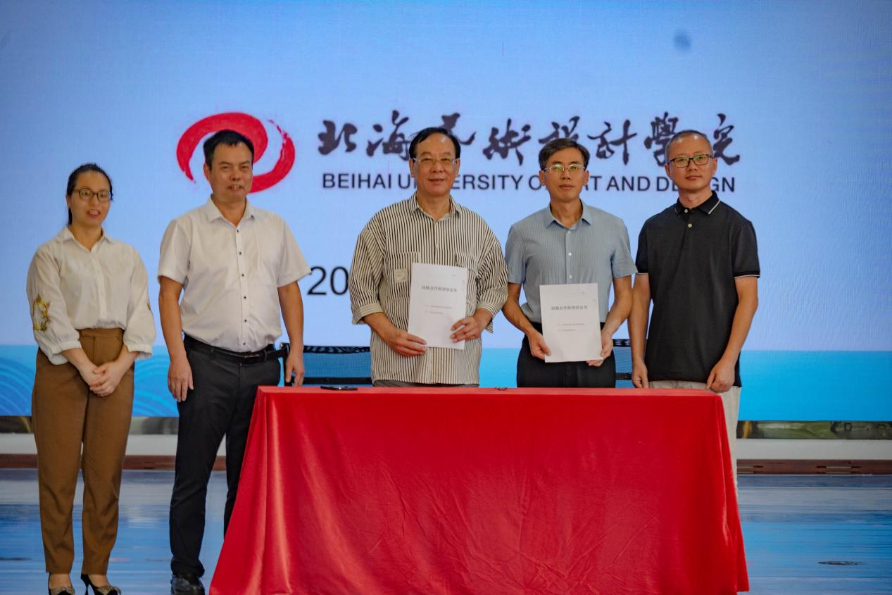 在开幕式最后,我校哲学和贵州大学哲学学院基于共同的价值观和社会历史使命,以及在各自的学科发展中的定位与需求,达成了构建合作伙伴关系意愿。在北海艺术设计学院王斌总督学、贵州大学哲学学院党委周乐成书记、北海艺术设计学院人文教育学院熊秀峰院长的见证下,由院长、哲学专业学科带头人蒙绍荣教授和贵州大学哲学学院梅其君副院长签署了合作框架协议。在未来,两校将在学生培养、课程建设、学科建设、学术研究等方面开展深度的交流与合作。