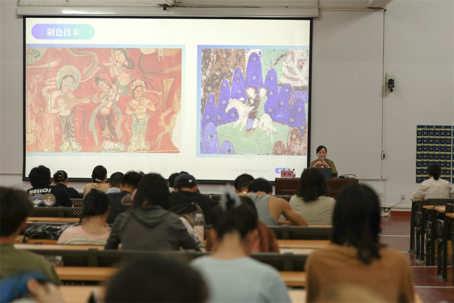 讲座伊始,李楠教授从制色技术介绍了天然矿物颜色、化工原料、动物颜色、植物颜色、矿物颜色、蓝铜矿颜料等古早颜色的提取方法,还阐述了制色技术演变与发展,进而引导现场师生掌握色的感知,并了解服装的质感与材料的关系。