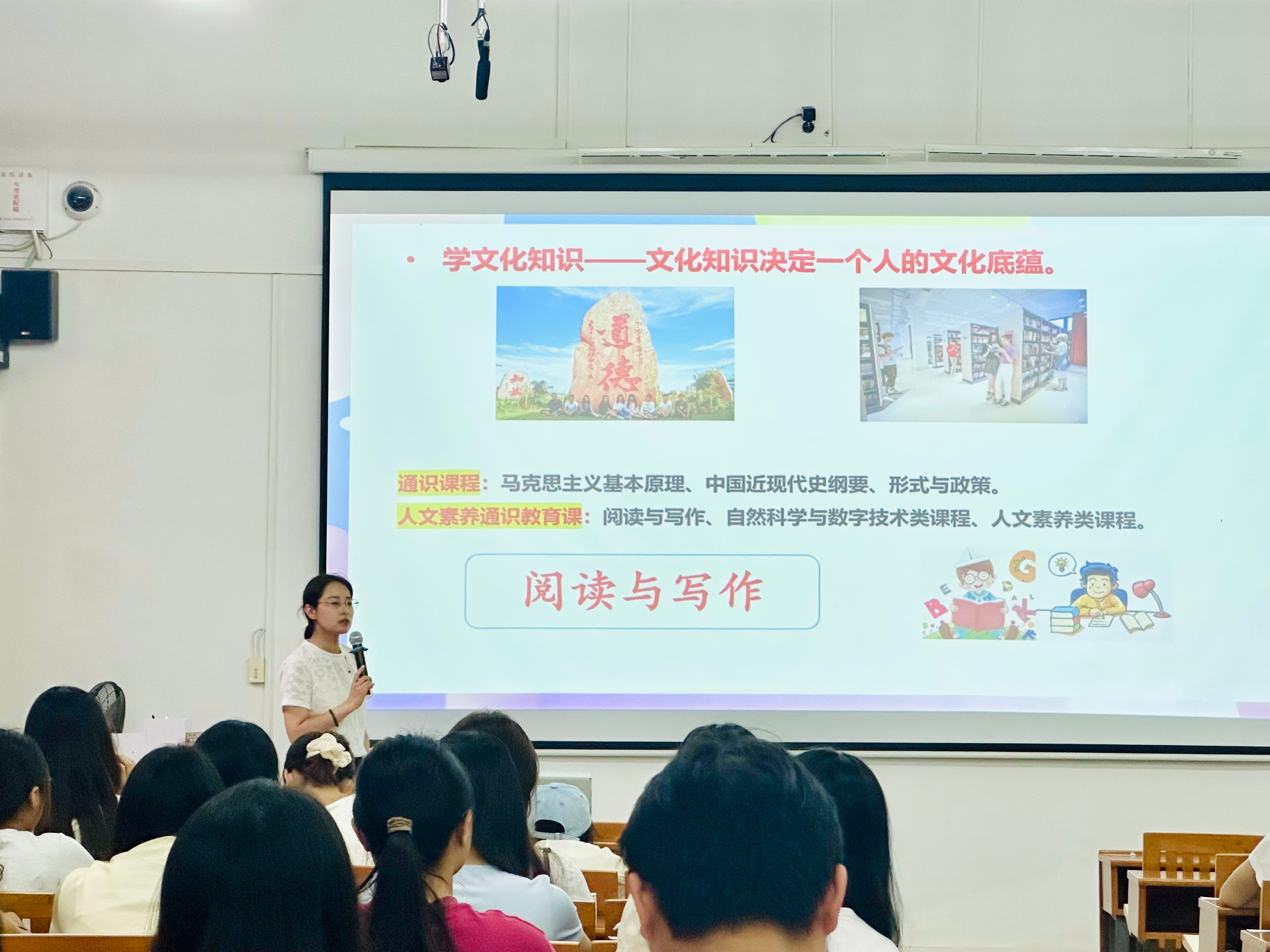 随后,教学副院长蔡森为专升本新生系统讲解学业规划与大学学习要点。蔡森副院长围绕“认识大学学习”展开详细分享。首先强调大学学习的首要任务是践行社会主义核心价值观,叮嘱新生要扣好人生“第一粒扣子”;其二,重点解读人才培养方案,介绍了通识课程与人文素养课程的设置逻辑,提及阅读与写作对提升综合表达能力、逻辑思维能力的关键作用,同时明确汉语言文学专业的阅读要求;其三,提出专业的学习建议,鼓励新生尝试跨专业学习、主动考取职业证书等,希望新生能借助这些课程实现“文”“艺”兼修,提升综合竞争力。