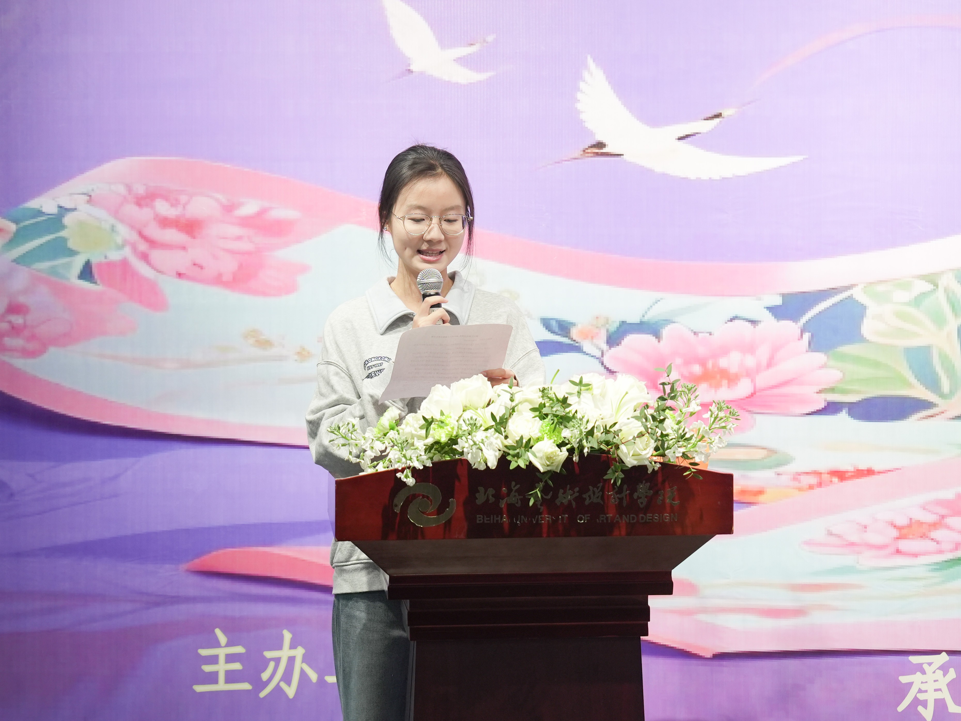 开幕式上,校团委书记唐良春在讲话中充分肯定了本届大赛的组织工作与核心立意,大赛为师生搭建了优质的创意交流平台,集中展现了参赛学子的设计巧思与创作热忱。参赛作品将北艺精神、北海风情与校训内涵融入丝巾设计,生动呈现了学子扎根文化、大胆创新的青春风采,对推动校园文化建设与美育工作具有重要意义。