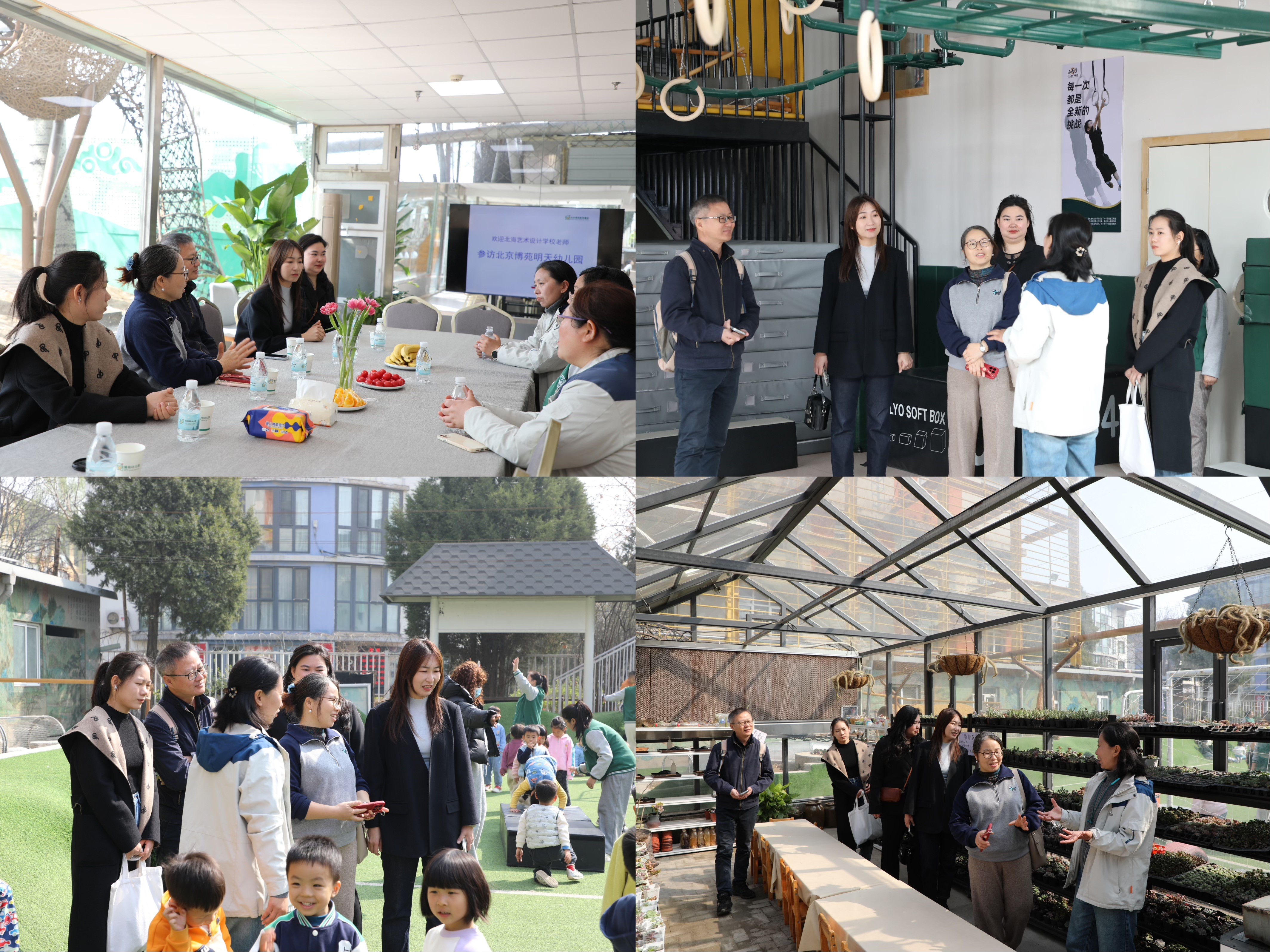 3月25日,考察团再次启程,由北海艺术设计学院总督学王斌带队,教育学院院长熊秀峰,北京实践基地副主任严腾、班主任张帆、雷蕊、王飞等教师代表,先后走访北京博苑明天幼儿园、北京市昌平欣宇幼儿园、韵海之声培训学校(清河)。在各单位负责人的陪同下,考察团深入教学一线,观摩课堂活动、艺术实训场景,详细了解各机构在幼儿教育理念、艺术启蒙、师资培养等方面的特色做法与用人需求。