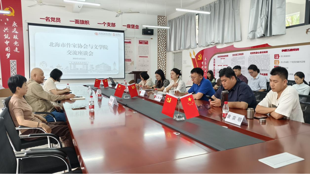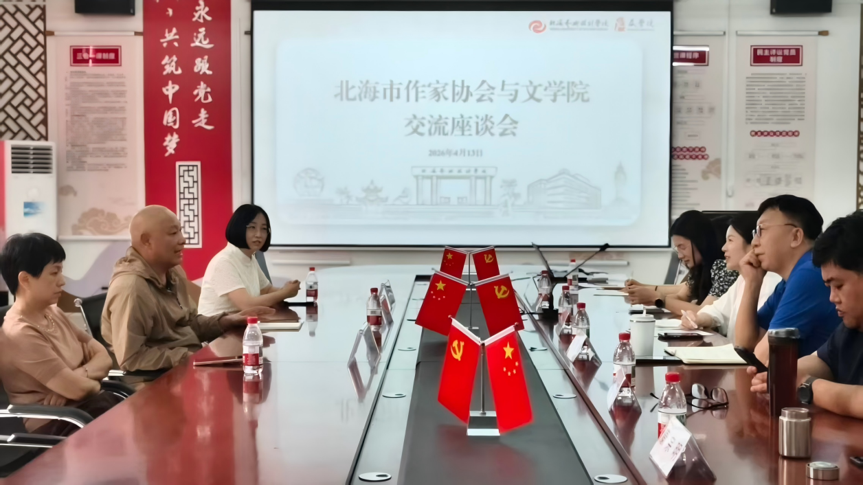 为推动文学教育与创作实践深度融合,搭建校地文学交流合作桥梁,2026年4月13日下午3点,文学院在北海艺术设计学院功德楼204会议室,与北海市作家协会(以下简称“市作协”)召开交流座谈会。北海市作家协会主席庞白,副主席苏晴、赵梧桐,文学院党支部书记岳莹,常务副院长梁镨文,教学副院长包瑞峰,汉语言文学专业教研室主任姜玮、副主任康宗明及相关课程专任教师代表参会,双方围绕各项合作事宜展开深入探讨,凝聚合作共识。