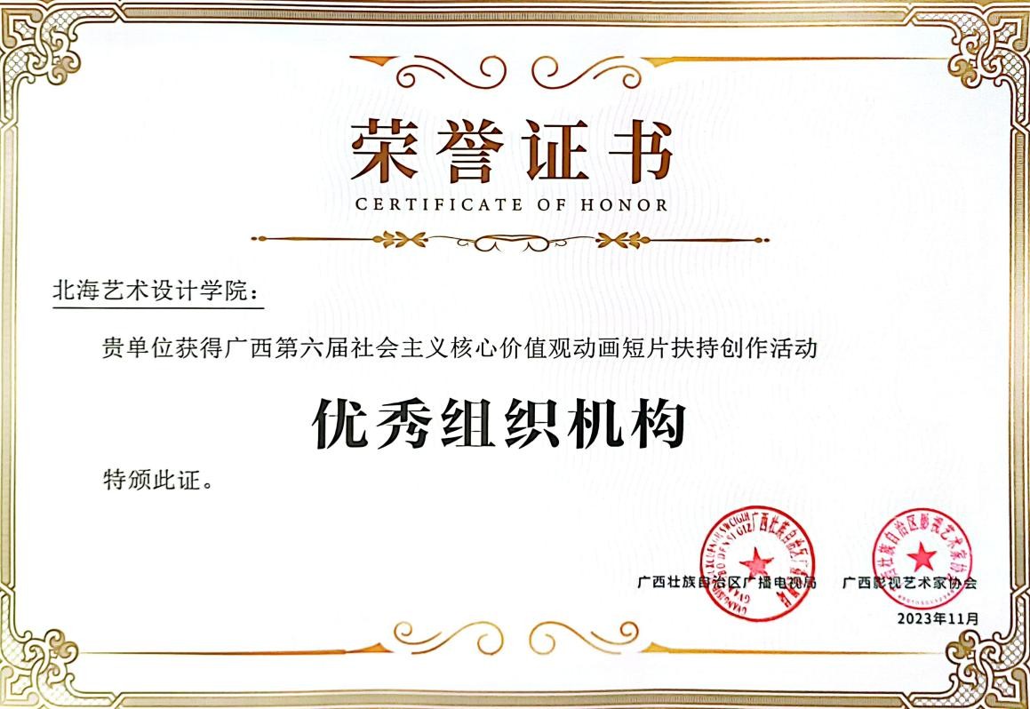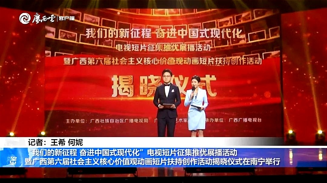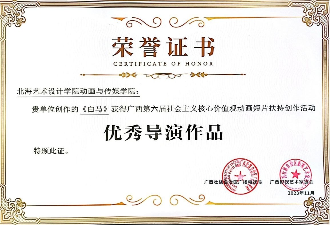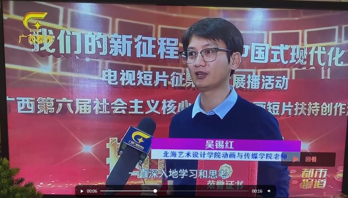 11月23日晚,由广西广播电视局与广西影视艺术家协会联合主办、广西广播电视台承办的“我们的新征程 奋进中国式现代化”电视短片征集推优展播活动暨广西第六届社会主义核心价值观动画短片扶持创作活动揭晓仪式在南宁举行。校动画与传媒学院报送的作品在本次评选中入围作品2获得优秀导演作品1项,我校获优秀组织机构奖动画与传媒学院动画教研室主任吴锡红、动画专业教师周亭、崔兢瑞代表学院出席活动并领奖。