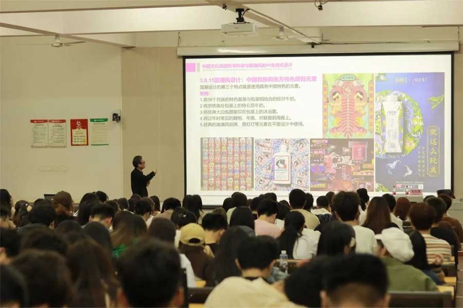 范凯熹教授还详细讲解了如何通过AI生成式设计呈现作品。AI生成式设计是人工智能设计中的一种,通过此技术解决前端设计,由此提升设计师的工作效率。范凯熹教授通过大量案例分析,说明了中国文化基因符号转译与国潮风的AI生成式设计浑然一体,中国文化元素与国潮风设计相辅相成,利用AI生成式技术将二者结合并生产出国潮产品。他希望广大的师生、设计师们合理运用AI生成式技术,将中国传统文化融入自身设计, 提升作品的文化内涵,赋予作品独树一帜的魅力,把“中国风”推向国际舞台。