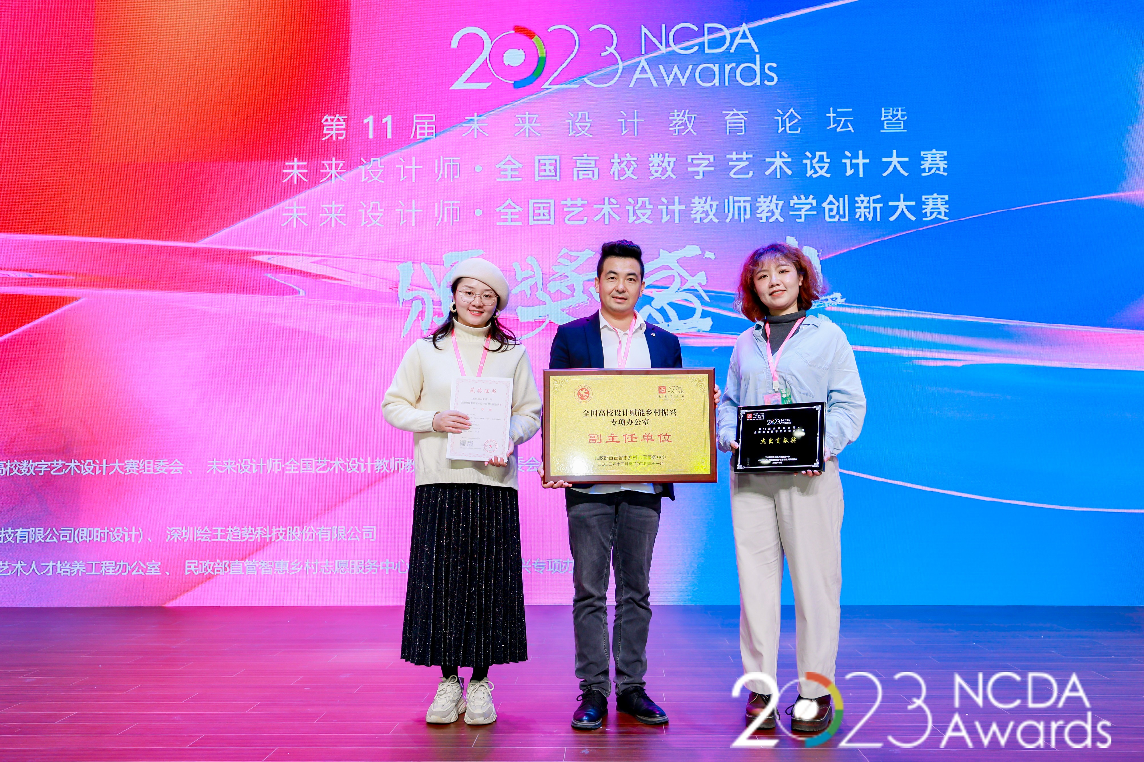 12月1日,2023第11届未来设计师·全国高校数字艺术设计大赛(NCDA)和未来设计师·全国艺术设计教师教学创新大赛(NDTC)全国总决赛颁奖典礼在上海举行。我院师生在全国总决赛中取得优异成绩!共荣获全国赛区一等奖2项、二等奖4项、三等奖5项;“优秀指导教师奖”2项;“优秀组织教师奖”1项。学校荣获“全国高校设计赋能乡村振兴专项办公室——副主任单位”和“第11届未来设计师·全国高校数字艺术设计大赛——杰出贡献奖”。