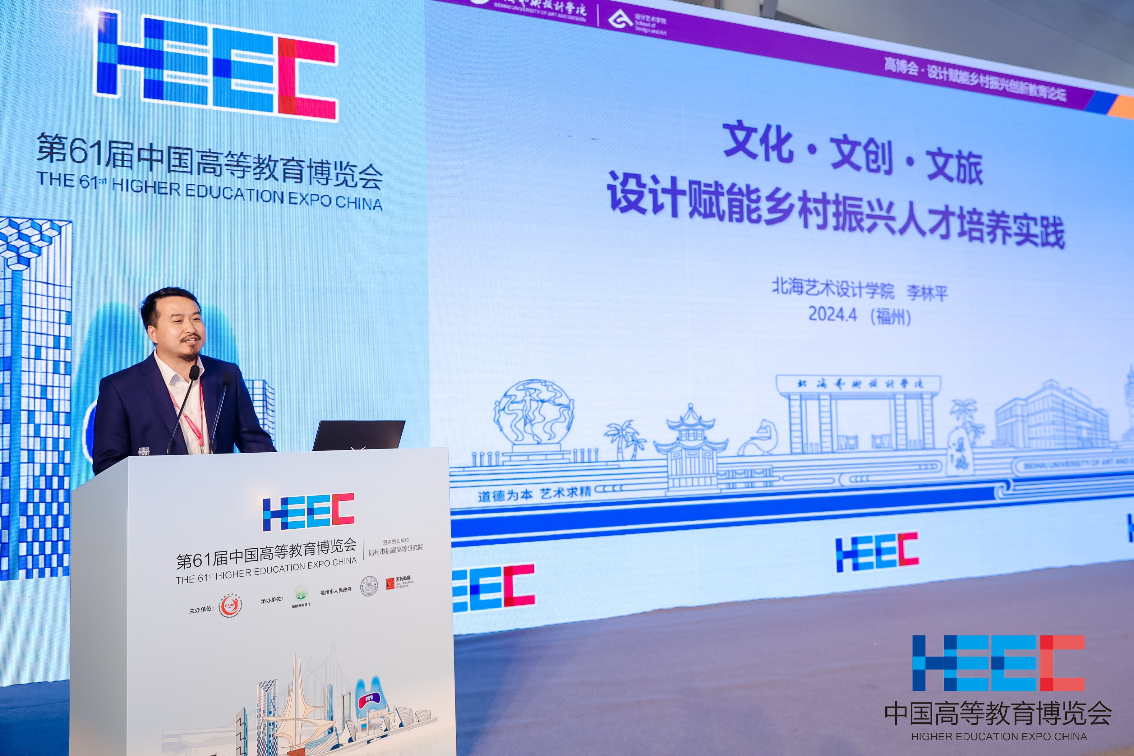 4月15日下午,院长李林平教授受邀作为演讲嘉宾,发表了“文化·文创·文旅——设计赋能乡村振兴人才培养实践”的主旨报告,报告围绕着设计教育在乡村振兴中所面临的问题,提出了设计赋能乡村振兴人才培养的策略和路径,并总结了设计艺术学院近年来乡村振兴领域取得成效。