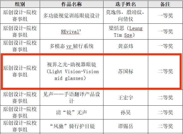近日2024深圳国际眼镜(智能穿戴)设计大赛暨第八届横岗眼镜设计师评选决赛在龙岗举行大赛以“镜启未来·艺数共生”为主题自启动以来,共征集到原创设计-院校赛事组1202份作品,经过激烈角逐,我校设计艺术学院产品设计专业2021级学生苏国标参赛作品《视界之光-助视器眼镜》在此次大赛中脱颖而出,荣获二等奖指导老师:邓渠成