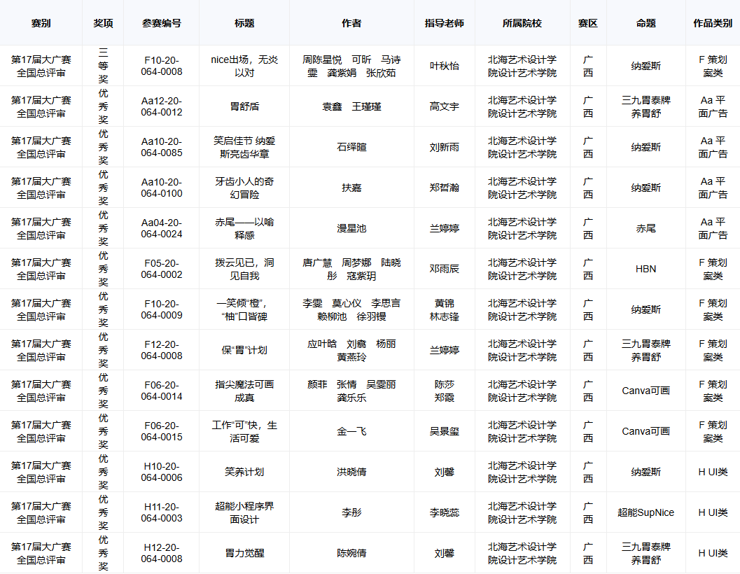 近日,第十七届全国大学生广告艺术设计大赛获奖名单揭晓,在我院师生共同努力下,共获得55个奖项,其中全国三等奖1项,全国优秀奖12项,省级一等奖6项,省级二等奖12项,省级三等奖24项。