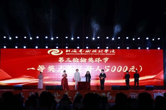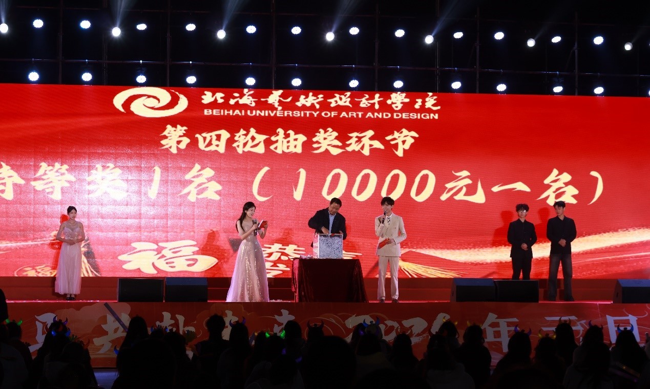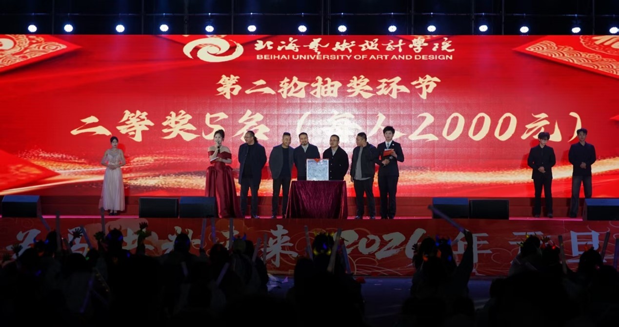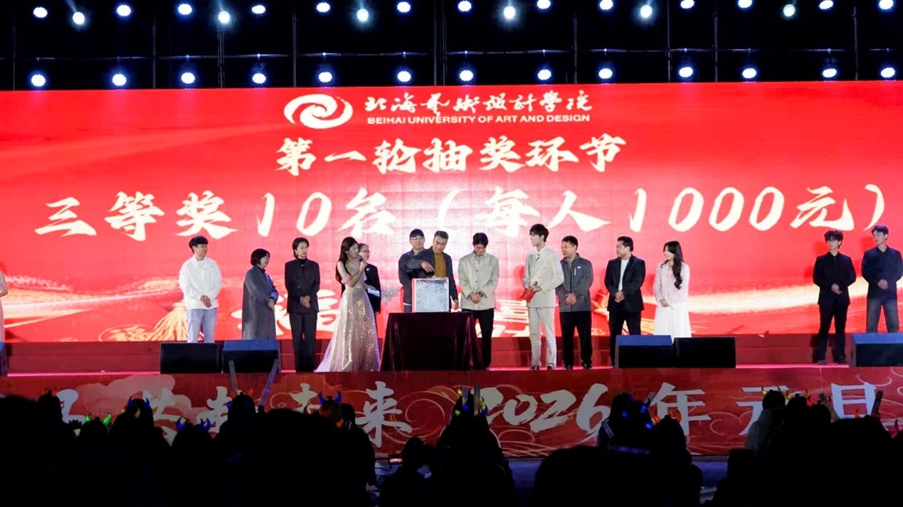 篇章二:雅韵流转 古风舞蹈《十二花神赋》以曼妙舞姿为现场铺展开一幅诗意盎然的画卷。 歌伴舞《跃》将青春向上的力量与艺术表达的张力相融,为雅韵篇章注入蓬勃生机。 走秀《Secret Realm》模特步履款款间尽展传统美学与现代设计的交融之美,将晚会推向高潮。 在优美的歌舞走秀后,第二次抽奖紧接着开始。 篇章三:华章共赏 舞剧《走进光里》借灵动舞步在光影中绽放民族之美,以民族舞蹈演绎文化传承与光明希冀。 民乐《晚夜微雨问海棠》将古典诗词的缱绻意境娓娓道来。 古风走秀《入画·二十四韵》将国风之美与艺术巧思完美融合。 精彩的表演先告一段落,一等奖的抽取随之到来。在抽奖之前,卢校长为大家送上新年祝福,祝愿同学们、老师们在新的一年以梦为马共创佳绩。 篇章四:远景可期 融合型情景剧《潮起东方》尽显对未来的无限憧憬与坚定信心。 舞剧《粤绣悦美》以灵动舞步诠释粤绣的独特魅力。 融合型情景剧《如愿》用真挚的表演传递温暖力量。 在热闹的氛围下,展开了最激动人心的特等奖抽奖环节。 在公布获奖同学名单前,覃书记对所有参与节目筹备的全体师生致以衷心的感谢。同时,赞扬了北艺学子们的精彩演出。最后,祝愿全体师生新的一年平安顺遂、共同进步! 此次元旦晚会的成功举办,既为广大学子提供了挥洒才情的天地,更让蓬勃向上的校园氛围浸润人心。新程已启,愿北艺青年们携晚会的满腔热血, 以实干笃行,以拼搏致远,书写新的华丽篇章。(苏媛怡、高泽娅、陈梓暄、王哲、何宛谚/摄)(获奖同学与领导老师合影)