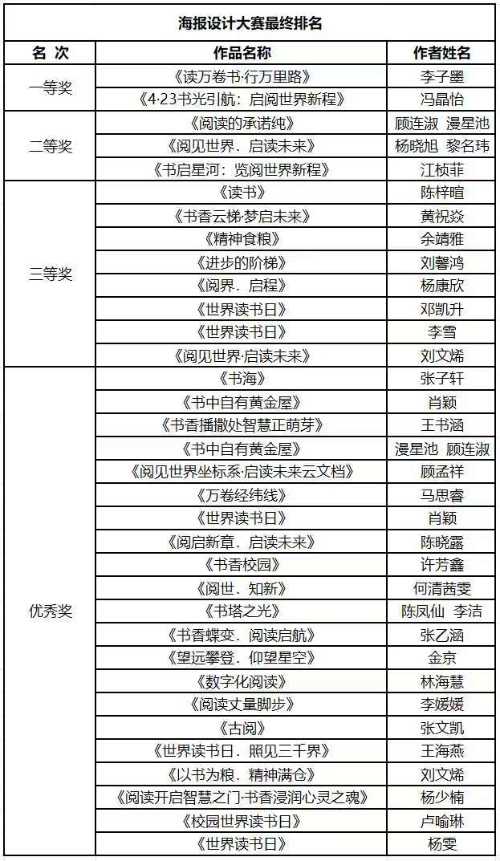 作为重头戏的“世界读书日”校园海报设计大赛首次设立纯设计与AIGC双赛道,这也为同学们的海报创作提供了新的设计思路。评审老师介绍:“参赛作品在创意表现、技术应用等方面有较高的水准,特别是AIGC赛道作品将人工智能与传统设计完美融合是一次特别的创作尝试。”经专业评审团三轮遴选,海报设计共有三十四人次获得各类奖项,获奖名单如下: