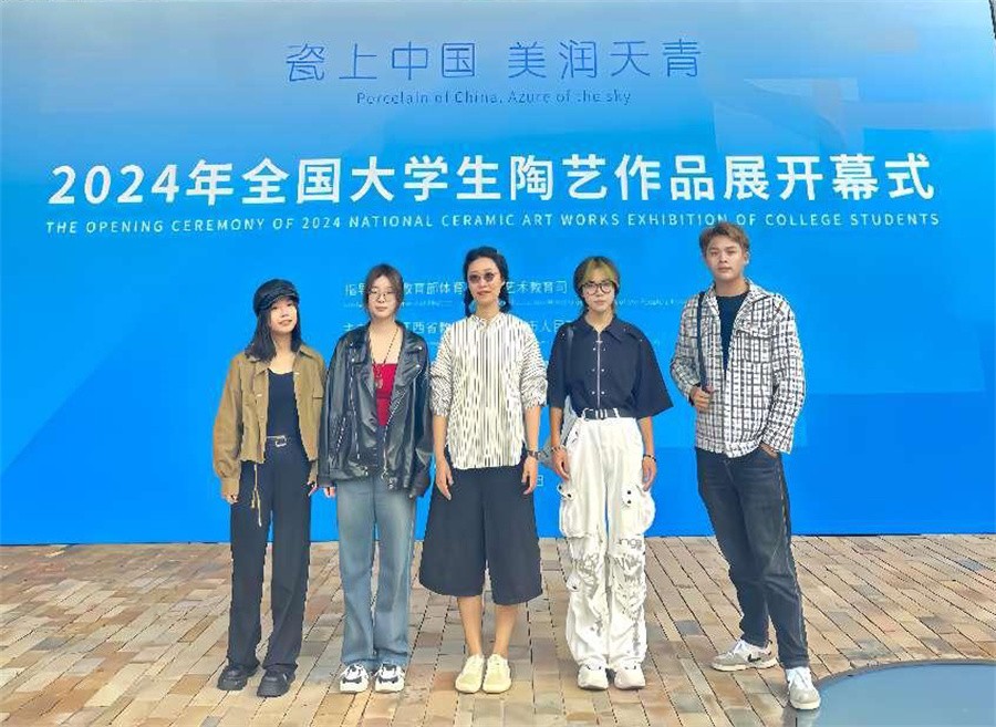 近日,由教育部体育卫生与艺术教育司指导,江西省教育厅、景德镇市人民政府主办的“瓷上中国, 美润天青”2024年全国大学生陶艺作品展在江西景德镇顺利开幕。我校美术学院雕塑专业学生付新婷作品《壮族风韵:梦回花山》、刘源作品《彝族乡情——晚读》入选此次展览。美术学院副院长金凯婧带领展览入选学生及雕塑专业部分学生参加开幕式。