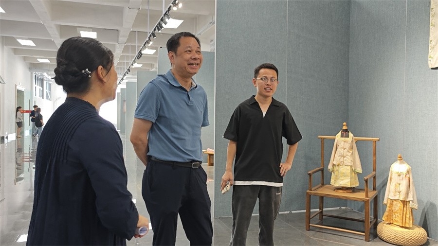 开幕式结束后,出席开幕式的领导嘉宾及师生一同步入展厅,共赏明韵风华,近距离欣赏了学生亲手制作的服装作品。