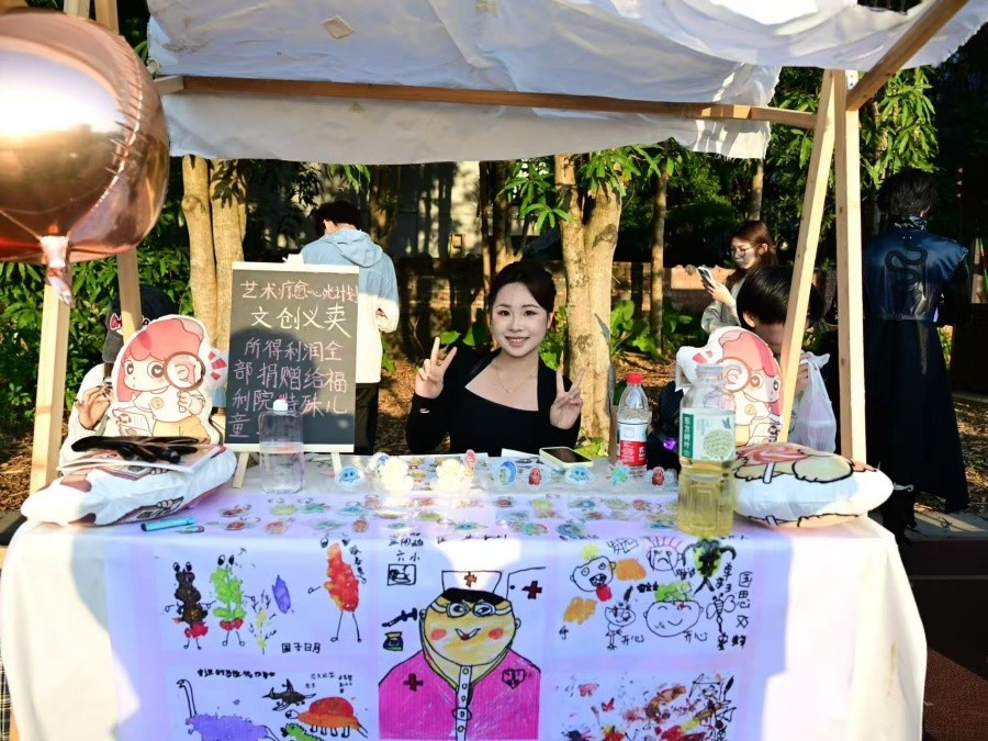 系列课程结束后,影视动画学院分团委组织开展一场特殊的爱心义卖活动。义卖摊位上,福利院孩子们的手绘作品被统一打印成海报进行展示,每一幅作品均承载着孩子们的童真与梦想。同时,学院分团委志愿者为福利院儿童专门创作的动漫文创IP产品,吸引众多过往师生驻足了解并选购,师生们以实际行动传递公益爱心。