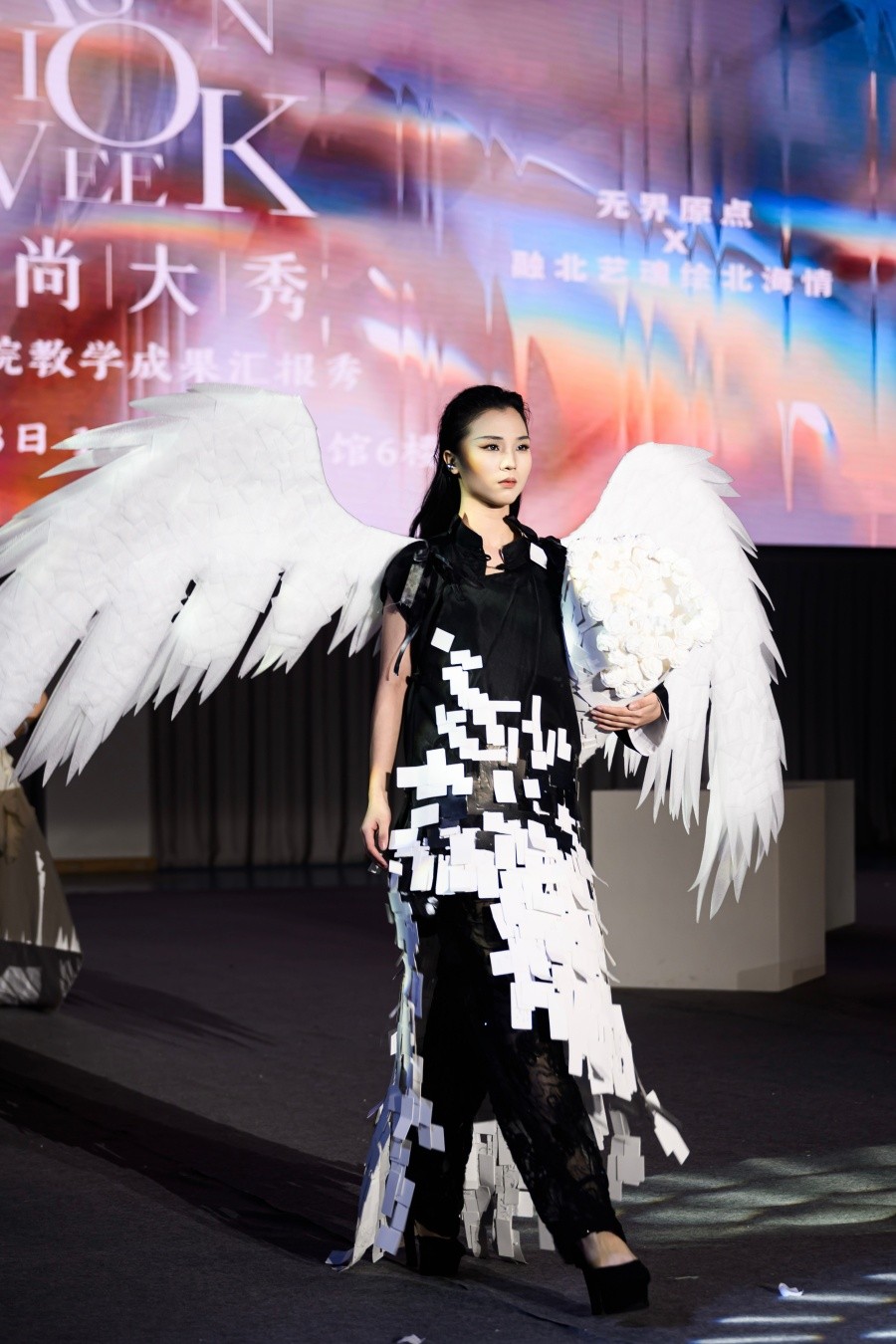 此次汇报秀以“无界原点”为主题,去除传统束缚,聚焦材料实验、形态探索与设计初心,集中展示了66组学生创意作品,呈现了课程在教学实践与创意启发上的阶段性成果。此次走秀以白色为主基调,学生运用纸张、织物等多元物料,通过剪裁、编织等工艺手法,将设计构思转化为可穿戴造型,系统呈现对服装形态、结构的探索成果,以及对设计本源的思考。在统一的材料与色彩框架下,作品既体现约束中求突破的设计思维,又展现简单中显丰富的创意表达,完成了对服装设计学科基础认知的可视化呈现。