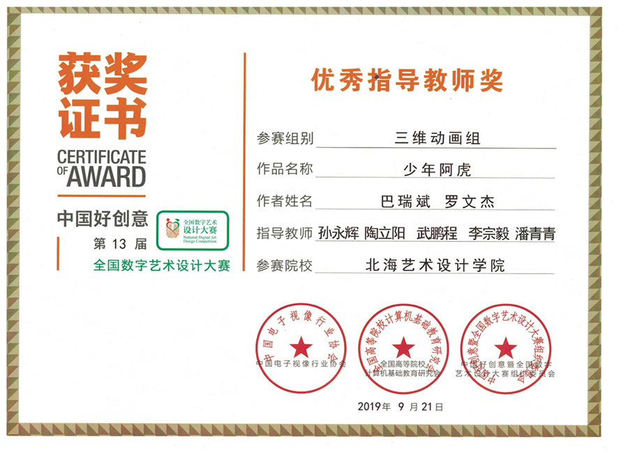 第十三届中国好创意全国数字艺术设计大赛颁奖盛典于2019年10月24日至10月28日在杭州浙江工业大学成功举行。动画学院在众多参赛作品中脱颖而出,共获得了1金1铜的好成绩。